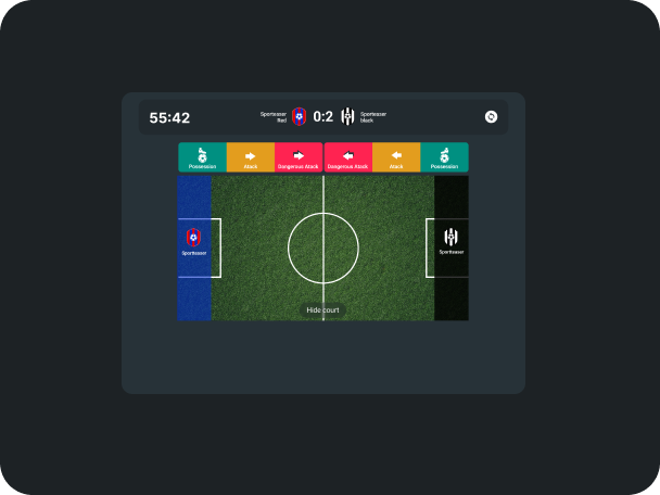 Enables control of scoreboards and TVs. The scorekeeper can switch scenes in real time, display the score, or show the announcements for upcoming matches or statistics.